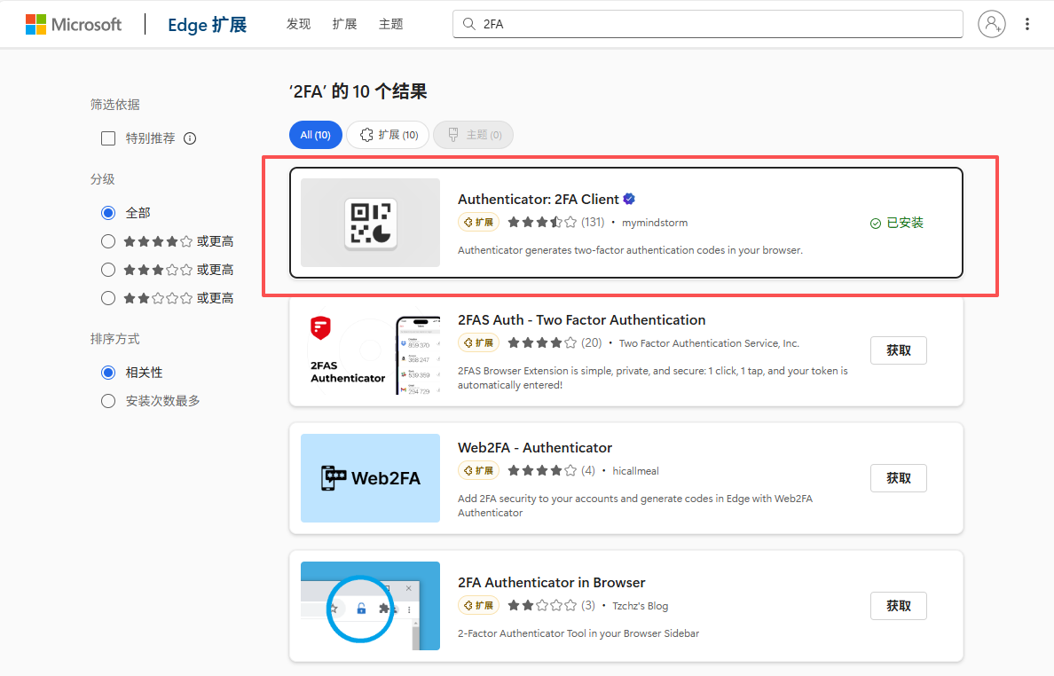 为了快速测试,我们使用浏览器插件的方式,我使用的是Edge 浏览器(因为它的浏览器插件安装不用梯子,Google浏览器这些需要梯子)。我要安装的是:Authenticator: 2FA Client 。