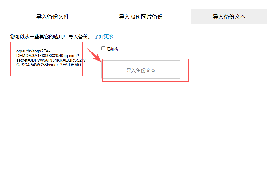 otpauth://totp/2FA-DEMO%3A16888888%40qq.com?secret=JDFVW66IN54KRAEQRSS2WQJSC4I54WG3&issuer=2FA-DEMO来测试