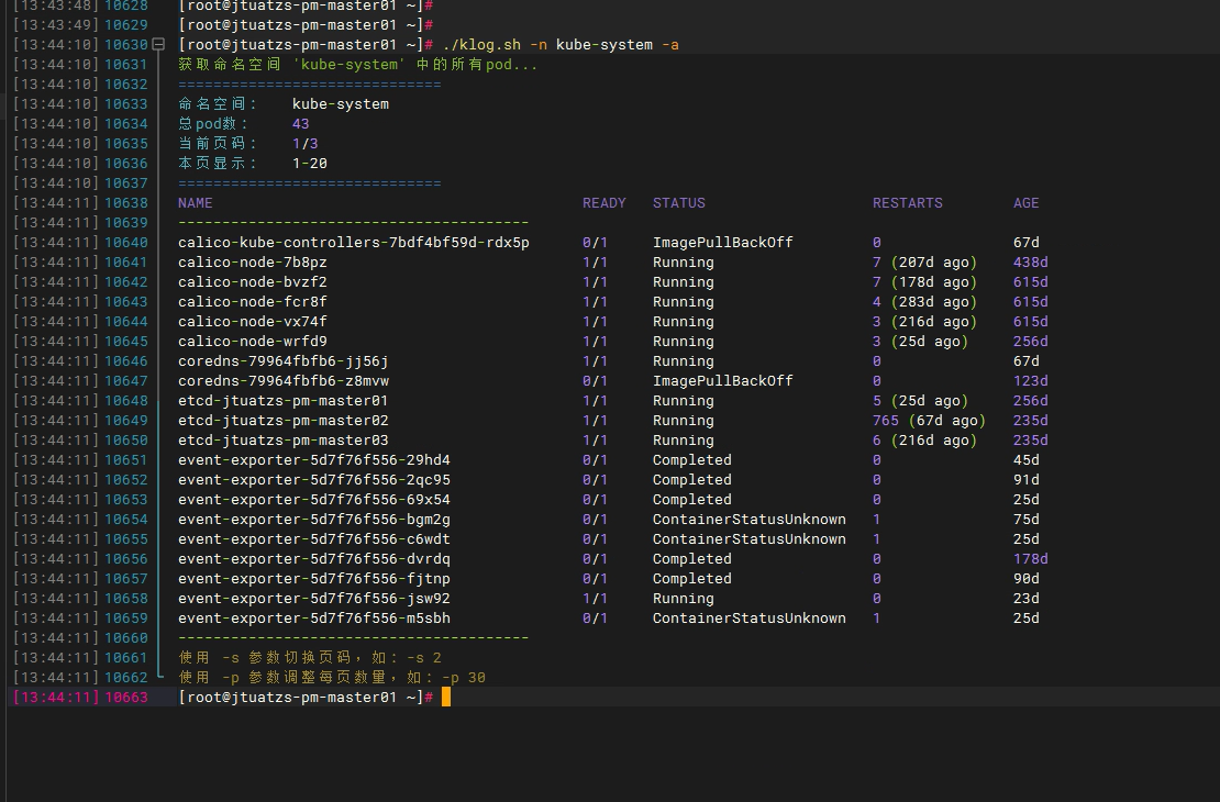 show_help() { echo -e "${GREEN}Kubernetes 日志查询工具${NC}" echo "用法: $0 [选项] [服务名]" echo "" echo "选项:" echo " -n NAMESPACE 命名空间 (默认: $DEFAULT_NAMESPACE)" echo " -t LINES 显示最后N行 (默认: $DEFAULT_TAIL)" echo " -f 实时跟踪日志" echo " -g PATTERN grep过滤模式" echo " -c CONTEXT grep上下文行数 (默认: $DEFAULT_CONTEXT)" echo " -l 列出包含指定名称的pod" echo " -a 列出所有pod(支持分页)" echo " -p PAGE_SIZE 分页大小,与 -a 一起使用 (默认: $DEFAULT_PAGE_SIZE)" echo " -s PAGE_NUM 指定页码,与 -a 一起使用 (默认: 1)" echo " -h 显示帮助" echo "" echo -e "${BOLD}使用示例:${NC}" echo " ${CYAN}# 基本使用${NC}" echo " klog user-service # 查看 user-service 日志" echo " klog -n prod api-gateway # 查看生产环境 api-gateway 日志" echo "" echo " ${CYAN}# 实时日志${NC}" echo " klog -f auth-service # 实时跟踪日志" echo " klog -f -t 50 payment-service # 实时跟踪最后50行" echo "" echo " ${CYAN}# 日志过滤${NC}" echo " klog -g ERROR order-service # 过滤 ERROR 日志" echo " klog -g 'payment.*fail' -c 20 # 过滤并显示20行上下文" echo "" echo " ${CYAN}# Pod 管理${NC}" echo " klog -l user # 列出包含 'user' 的 Pod" echo " klog -a -n default # 列出 default 命名空间所有 Pod" echo " klog -a -p 10 -s 2 # 分页查看,每页10条,第2页" echo "" exit 0 }